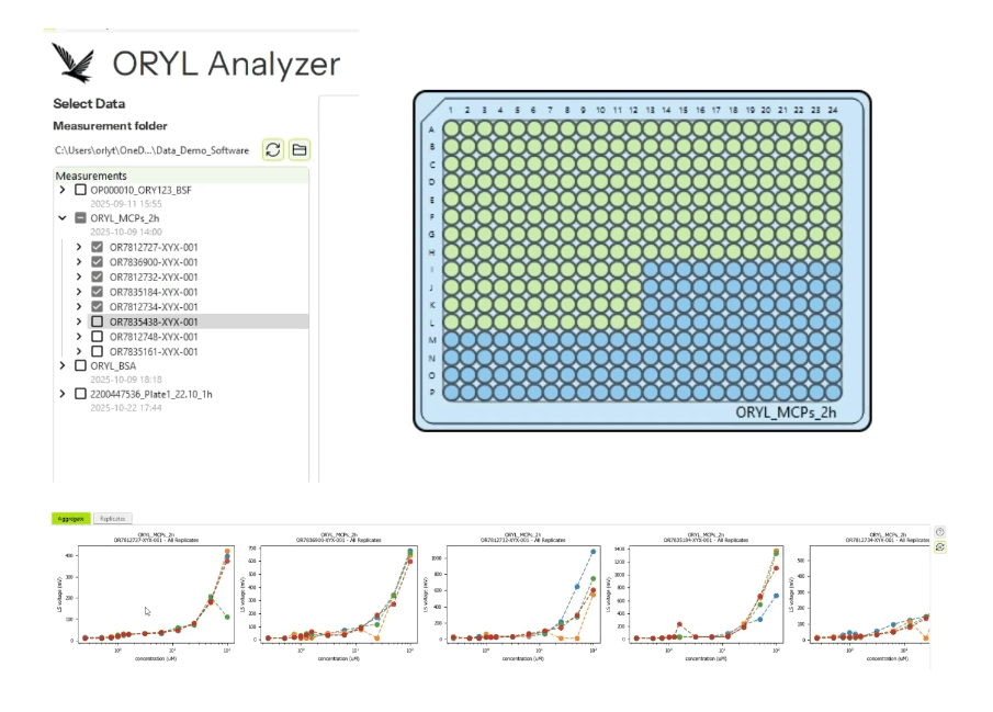 The companion software to the ORYL F1. Processes raw SHS and LLS signals into clear, actionable results. Visualize solubility and aggregation profiles, compare conditions, and export data — all within a clean, purpose-built interface.